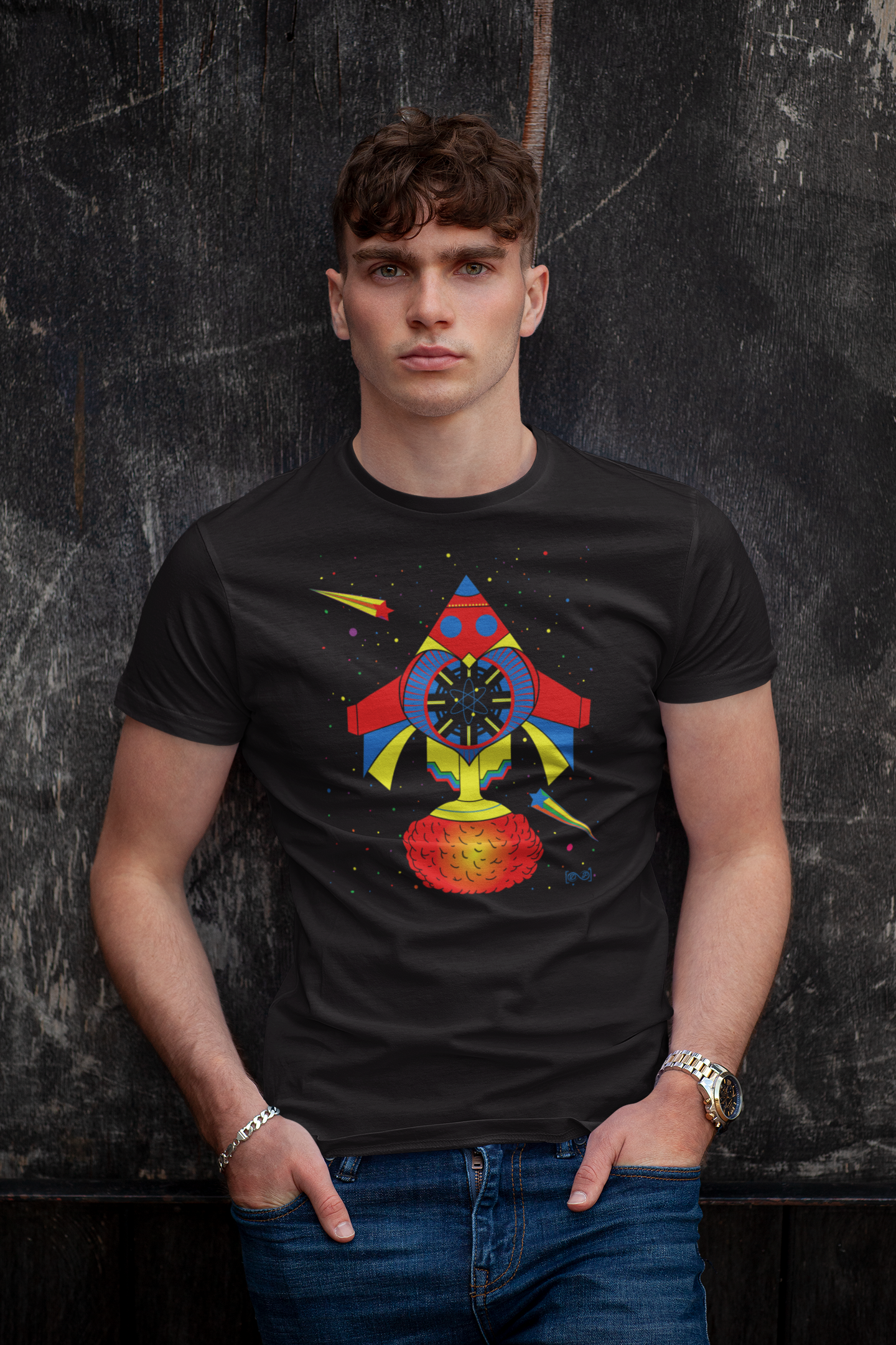 In this design, we have a flat rocket that has the atomic bohr model in the center with electrons spinning around in their orbit. As the electrons are spinning around producing energy, this powers the turbine blade to spin. Which in essence is lifting the rocket off the shirt from the z-axis. Pretty complex. We Know. Your the aerospace engineer, therefore, we know your ready to take flight.
